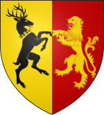 King Joffrey's banner shows the crowned stag of Baratheon, black on gold, and the lion of Lannister, gold on crimson, combatant.
