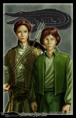 The slender girl Meera is armed with woven net, bronze knife, and frog spear as well as an iron helm, leather shield, and bronze-scale jerkin. Her younger brother Jojen is unarmed and dressed all in green, which brings out the deep green of his eyes. Kneeling before the dais, the Reeds explain that they have come to renew House Reed's fealty to the King in the North. Bran explains that Robb is away fighting but says they may say their words to him. Together, the Reeds recite their ancient oath, swearing by earth and water, by bronze and iron, and by ice and fire never to fail the Starks of Winterfell. Unsure how to respond, Bran finally decides on "May your winters be short and your summers bountiful," and bids them rise. Meera offers gifts of fish, frog, and fowl, and Bran offers them the meat and mead of Winterfell in return.