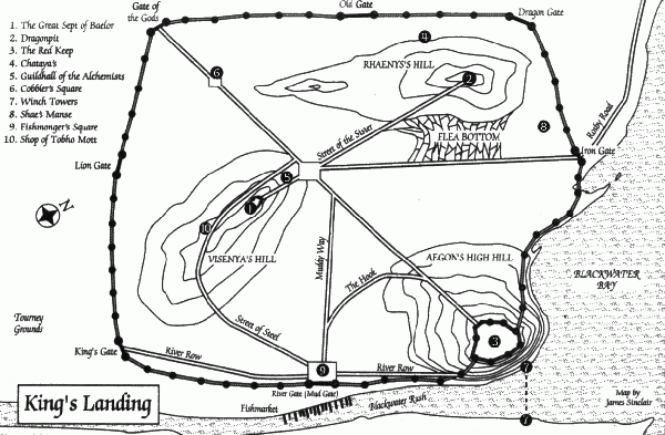 The Map of King's Landing in A Clash of Kings consists of geographical about the City of King's Landing. It was drawn by James Sinclair.