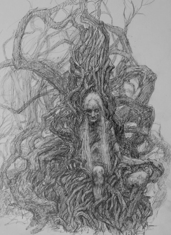 Bran enters the mind of Hodor to help him fight off the wights. Meera reaches him as he waves her up the hill and grabs Jojen. Someone sets the wights on fire. Bran awakens in the cave before a child of the forest. She takes them down into the cave, but Coldhands cannot follow them due to the ward on the cave against dead things. They go deeper, underneath roots and across a floor of bones, till they reach a skeletal body sitting on a throne made of roots - the three-eyed crow, the last greenseer.
