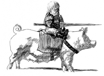 Still on board the Selaesori Qhoran, Tyrion jousts on Penny's 'Pretty Pig', for the amusement of the crew in hopes of sweetening their mood, while the ship has been floating becalmed in the Gulf of Grief. Attempts to tow the cog north in hope of finding a breeze, using small rowing boats, have been unsuccessful.