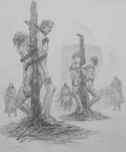 Fueling those tensions, Ser Godry Farring the Giantslayer, Ser Corliss Penny and Ser Clayton Suggs are about to burn the four cannibals in sacrifice for R'hllor, hoping to stope the snowfall. Northerners Artos Flint and Big Bucket Wull express dislike of the sacrifice. Asha has noticed that Clayton Suggs is a cruel man and fears that he may eventually turn against her.