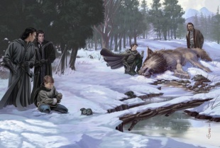 Jon calls from up ahead for them to come see what he and Robb have found. They find Robb holding something in his arms next to the corpse of a wolf larger than Bran's pony. Jon correctly identifies the corpse as a direwolf. Theon comments that direwolves have not been seen south of the Wall for two hundred years. Bran then notices that Robb is cradling a small pup, and gives it a stroke after Robb reassures him. Then Jon gives him another pup.