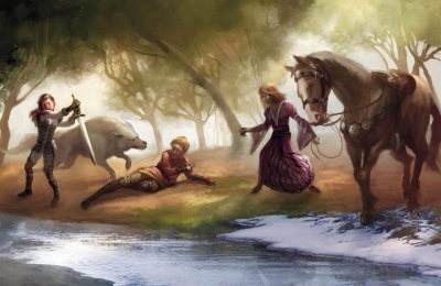 She finds Arya on the banks of the Trident, trying to comb the mud out of her direwolf Nymeria's fur. Arya is not interested in riding in the wheelhouse, and intends to go riding with Mycah to look for rubies in the river. Sansa insists that there is no fun in riding because there is nothing to see, but Arya is fascinated by all the new flowers and landmarks and people they are seeing along the way. Sansa informs Arya that she has to come, asking why anyone would want to ride a stinky horse when they could ride in the wheelhouse on pillows while eating lemon cakes and keeping company with the queen. Arya replies that she does not even like the queen and still intends to go riding. Sansa, giving up, leaves but Arya yells after her that Lady will not be allowed in the wheelhouse, which leaves Sansa speechless.