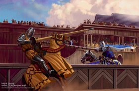 They watch the tourney from a place of honor. Jory Cassel, in drab armor, wins two matches, but loses a well-fought third match to the freerider Lothor Brune when King Robert judges Brune’s lance to have been steadier and better placed. The other contestants from Winterfell do not fare as well. Sansa and Jeyne both scream sometimes when the riders crash together. Sansa notes that Jeyne often covers her eyes when a rider falls, but knows how a great lady must act, and draws the approval of Septa Mordane for her composure.
