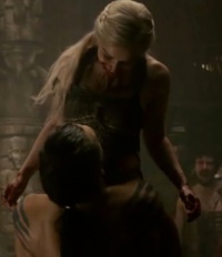 Drogo rises and declares through translation that Viserys’ place is not on the high bench but at the back where the lowest of the low sit shrouded in shadow so that others do not have to look upon them. Viserys declares drunkenly that that is no place for a king, but Drogo emphasizes that it is his place, mocking him as the Sore-foot King and the Cart King. Viserys draws his blade, angering the Dothraki.Then he spots Daenerys and stalks over. She begs him to throw away the sword but Viserys ignores her. Viserys demands his crown or else he will take Daenerys back, but he will be happy to cut out her child and leave it for Drogo. To emphasis his point, Viserys presses his sword against her belly hard enough to prick her navel through her silks.