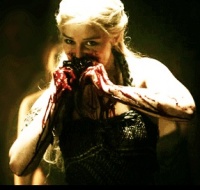 The stallion’s heart is still raw and steaming when it is placed before Daenerys. As part of the ancient Dothraki motherhood ritual she begins to eat the tough, stringy flesh. The Dothraki believe that the heart of the stallion will make her son strong and swift and fearless. If she chokes on the blood or retches the omens are less favorable: the child could be weak, deformed, stillborn, or female. In preparation, Daenerys has eaten bowls of blood and dried horse flesh and fasted for a day and a half, yet still her stomach roils and her jaw aches.