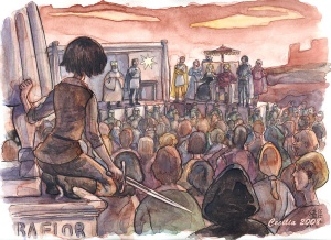 Arya follows the masses. All around her the townsfolk are discussing her father and the rumors of his treason. She pushes through the crowd and finds herself next to the statue of Baelor the Blessed, the Septon King, and climbs up so she can see. From this vantage point she can see her father supported by two gold cloaks in a rich velvet doublet and a grey cloak, his face drawn with pain and thinner than Arya has ever seen. With him on the pulpit are the High Septon, King Joffrey, Queen Cersei, the Hound, four other members of the Kingsguard, Varys, Littlefinger, and Sansa; Arya wonders why Sansa is there and why she looks so happy.