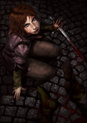 The Tickler says Gregor would prefer that Sandor come back with them to Harrenhal, but when Sandor refuses, the Tickler throws a knife at him. Sandor, the Tickler and Polliver all draw swords and begin to fight. The squire tries to join in but Arya throws a cup at him and knocks him down. Sandor is not fighting his best and Arya realizes he drank his wine too fast and is drunk. During the fight Arya stabs the squire in the belly and then sneaks up behind the Tickler and stabs him over and over again in a rage until Sandor stops her. The squire is still alive but was mortally wounded and asks for mercy. Sandor tells Arya to give him mercy, and asks if she remembers where the heart is. She does. She recovers Needle, which was carried by Polliver, and kills the squire.