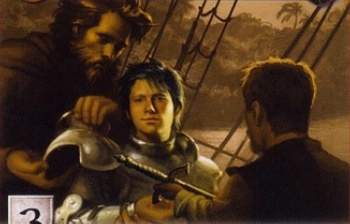 Aegon's journey brings him to Volon Therys, where he and Jon Connington head toward the camp of the Golden Company. Wearing red silk and a black cloak, the colors of House Targaryen, Aegon is introduced by Jon as Aegon VI, King of the Andals, the Rhoynar, and the First Men. This is met with silence by the officers, and Jon realizes the sellswords are already aware of Aegon's identity. They discuss Daenerys's lingering presence in Meereen, and whether they should join the ongoing conflict in Slaver's Bay. Aegon sees the opportunity to introduce his own plan of going to Westeros and claiming the Iron Throne in his own name. Harry Strickland tries to point out the risks, but most officers are eager to support this course of action. Aegon further explains that his aunt is welcome to keep Meereen. His plan is to move fast and strike hard, gaining a foothold before House Lannister can react. The Golden Company swear allegiances to Aegon, but the officers agree to keep his identity secret from the soldiers until they land in Westeros.[36]