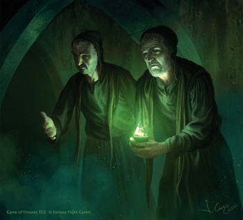 The Alchemists' Guild[1], also referred to as the Guild of Alchemists[2][3] is an old order of pyromancers. The guild was once powerful, though in the recent centuries, the maesters rose in prominence and pyromancers saw their influence dwindle.[4] The pyromancers still claim to posses vast secret stores of knowledge.[4]