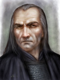 Alliser Thorne is a slim and sinewy fifty-year-old, dry and hard, with black eyes and black hair streaked with grey.[2][3][4] He has a thin smile, and a sharp, cold voice.[5][6] He is humorless, bitter, and mean spirited.[7][3]