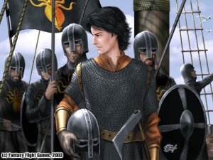 During the War of the Five Kings, Asha commands thirty longships for Balon's invasion of the north.[1] After stopping at Ten Towers to visit her mother, Alannys Harlaw,[4] Asha leads the taking of Deepwood Motte.[1] After the capture of Winterfell, Theon sends Stygg to request reinforcements from his sister.[12] Asha travels through the wolfswood to visit Theon at Winterfell, but she refuses to stay and help him defend the castle since it is so far inland.[5] The ten men left by Asha eventually abandon Theon prior to the battle at Winterfell.[13]