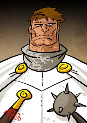 Balon's greathelm is decorated with wide white wings.[5] The trappings of his horse display battling black-and-white swans.[6] The silver brooch which clasps his cloak is decorated with ivory and onyx swans.[3] Balon is good with a lance, better with a morningstar, and exceptional with a bow.[2][7][2]