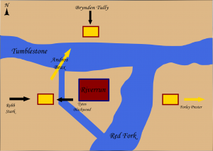 The camp between the rivers is overrun too, this time by men led by Robb Stark, Lord Jon Umber, and members of House Mallister coming in from the west. The Lannister force attempts to form a shieldwall, but are taken in the rear by a sortie from Riverrun led by Lord Tytos Blackwood.[2]