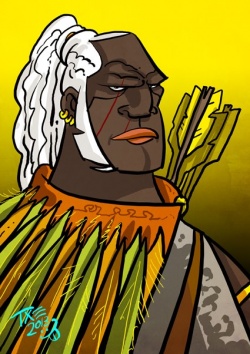 Balaq is a white-haired Summer Islander with skin as dark as soot. He wears his worldly wealth upon his person, including a feathered cloak of green and orange which is magnificent to behold. He wears a lord’s ransom in golden arm rings. [1]