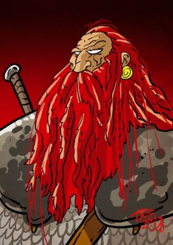 He is a huge man with a great bush of a beard with fiery red whiskers and long braids. He is described as a savage commander, with a ferocious appetite for slaughter, and no taste for peace. At table he is raucous, and enjoys both wine and women abundantly.[1][2]