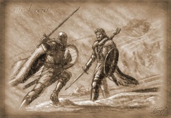 Bael the Bard and Brandon's grandson face off, art by Roman Papsuev. | |
