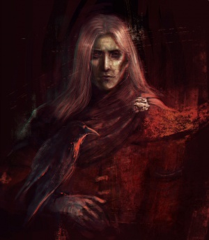 Brynden was an albino and thus had milk-white skin, long white hair, and red eyes.[11] On the right side of his face he had a red winestain birthmark that extended from his throat up to his right cheek from which he earned his name Bloodraven, as the birthmark was said to look somewhat like a raven drawn in blood. However, Ser Duncan the Tall thought the birthmark just a blotch.[1] According to George R. R. Martin it is more a suggestion of a raven shape, like an ink blot.[12]