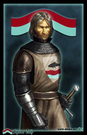 As the Knight of the Gate, Brynden wears grey heavy plate armor and helm, but when commanding outriders he trades this for mail and leather.[1][12] Brynden also owns grey ringmail under blackened steel, with a black trout adorning the helm's crest.[13] He rides a grey horse,[1] as well as a chestnut courser decorated in red and blue.[13] Brynden's cloak, in the blue-and-red colors of House Tully, is fastened by a clasp of obsidian and gold in the shape of a black fish,[1][12][13] his only concession to ornament.[14] The banner of his standard bearer depicts a black fish.[1]