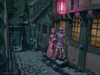 The brothel is a house two stories tall with a stone ground floor and a timber upper floor. A round turret rises from one corner of the structure. Many of the windows are leaded. Over the door swings an ornate lamp, a globe of gilded metal and scarlet glass.