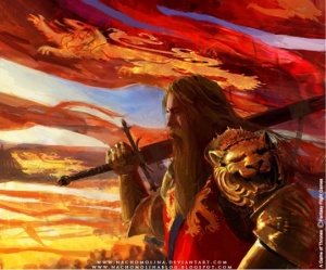 Daven wears gilded ringmail, a helm, and a fox-fur cloak.[4]
