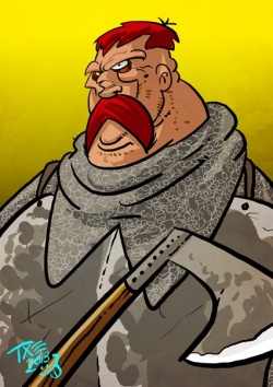 Denys wears his worldly wealth upon his person and a lord's ransom in golden arm rings. Each ring signifies one year's service with the Golden Company.[2]