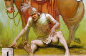 Intending to ride in the tourney for King Joffrey's 13th Name Day, Dontos's first match is against Lothor Brune. However, Dontos is too drunk, arriving in the lists naked except for his breastplate and helm. King Joffrey Baratheon takes this as a personal insult, and commands that Dontos be put to death via drowning in a cask of wine. However, the pleading of Sansa Stark saves his life, and Dontos is stripped of his knighthood and made a fool in motley instead.[6]