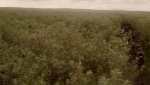 Over a hundred types of grass grow on the plains, often growing thick and taller than a man's head and from afar look like a sea, as it rolls like waves in the breeze.[7][8] Some rivers run through the lands, though they are often shallow and shift with the seasons; overall sand is more prevalent than water.[8] The grass is inhabited by packs of wild dogs, herds of free-ranging horses, and rare hrakkar.