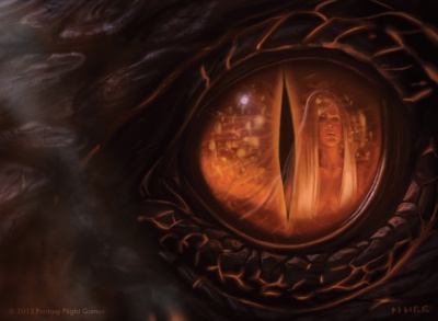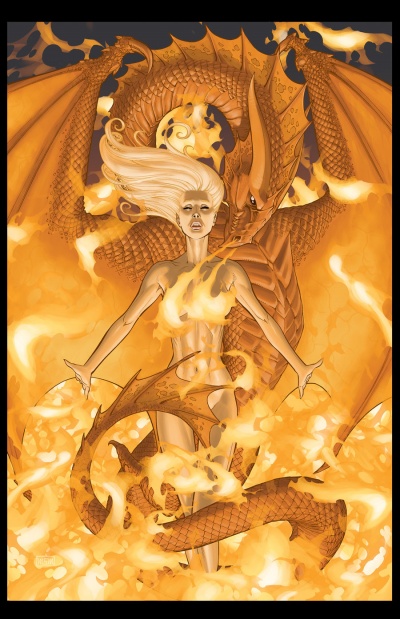 Viserys was hitting her, hurting her. She was naked, clumsy with fear. She ran from him, but her body seemed thick and ungainly. He struck her again. She stumbled and fell. He struck her again. She stumbled and fell. “You woke the dragon,” he screamed as he kicked her. “You woke the dragon, you woke the dragon.” Her thighs were slick with blood. She closed her eyes and whimpered. As if in answer, there was a hideous ripping sound and the crackling of some great fire. When she looked again Viserys was gone, great columns of flame rose all around, and in the midst of them was the dragon. It turned its great head slowly. When its molten eyes found hers, she woke, shaking and covered with a fine sweat.[3]