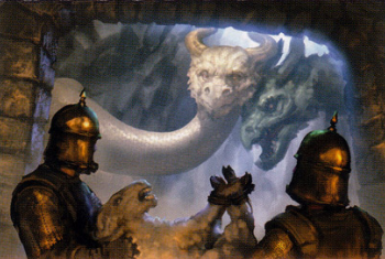 To get to the dragon pit you have to pass beneath 3 massive arches, go down a torch-lit ramp into the vaults beneath the pyramid, past cisterns, dungeons, and torture chambers (where slaves had been scourged and skinned and burned with red-hot irons). Finally you arrive at an entrance with a pair of huge, forbidding iron doors with rusted hinges, closed with a length of chain whose link is as thick around as a man’s arm. The doors were initially guarded by Unsullied, and later by Brazen Beasts. [1] [2]