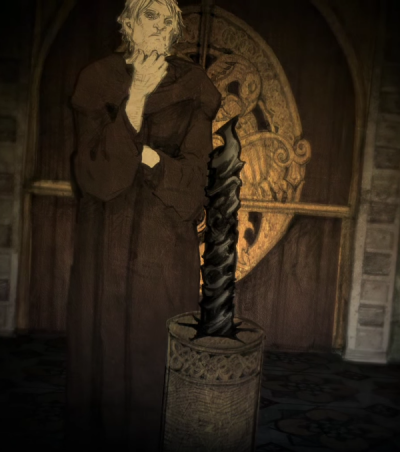 When Sam arrives at the Citadel, there is a black glass candle burning in Marwyn's study on the Isle of Ravens. Marwyn tells him that it burns but is not consumed.[4]