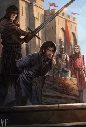 In response to his father's imprisonment for treason by Cersei, Robb Stark calls the northern banners to Winterfell and marches south.[63] For his part in Ned's downfall, Janos Slynt is named Lord of Harrenhal by King Joffrey.[64]