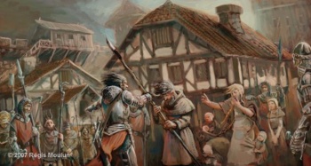 Flea Bottom is a down-trodden area of town. It has pot-shops along the alleys where one can get a 'bowl o' brown.' It has a stench of pigsties and stables, tanner's sheds mixed in with the smell of winesinks and whorehouses.[1] It is a maze of twisty, unpaved alleys and cross-streets below the Street of Flour on the way down the west side of Rhaenys's Hill. The buildings lean over the narrow alleys, almost touching.