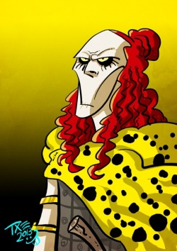 Gorys is cadaverous looking, with a pointed black beard and blood-red hair that tumbles about his shoulders in oiled ringlets. He wears a lord’s ransom in golden arm rings and a leopard skin draped across one shoulder.[1]