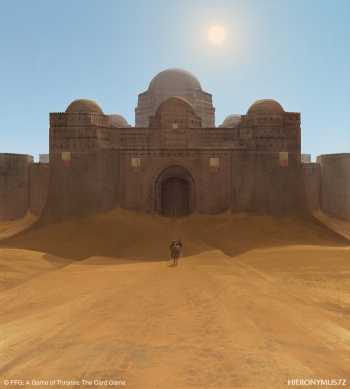 Hellholt, also called the Hellholt, is a castle and the seat of House Uller in southern Dorne. It is located near the source of the river Brimstone, east of Sandstone and west of Vaith.[1] The Hellholt is a grim, stinking castle.[2]