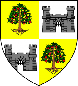 Quarterly: An apple tree on yellow, a grey gatehouse on white (Quarterly, first and fourth or, an apple tree proper, second and third argent, a gatehouse cendrée) |