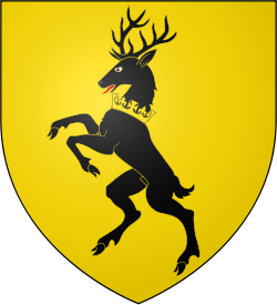 A black crowned stag, on a gold field (Or, a stag salient, crowned, sable) |