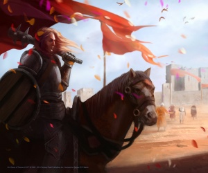 Lord Jon Arryn, the Hand of the King, dies suddenly in King's Landing. King Robert I Baratheon and his retinue travel to Winterfell to offer the position to Lord Eddard Stark, Robert's friend from his youth. Lord Renly Baratheon rides north to meet King Robert on his return trip after Eddard accepts the position, while Lord Stannis Baratheon returns to his seat at Dragonstone. Renly participates in the Hand's tourney, riding well before losing to Sandor Clegane.
