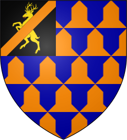 Vairy orange and blue, upon a black canton, a golden stag beneath an orange bend sinister (Vairy tenné and azure, on a canton sable a stag or debruised by a bend sinister of the first) |