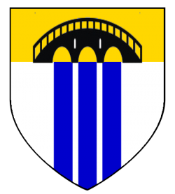 A black stone bridge with three arches upon a golden chief above three blue pallets on white (Argent, three pallets azure, on a chief or a stone bridge of three arches sable) |