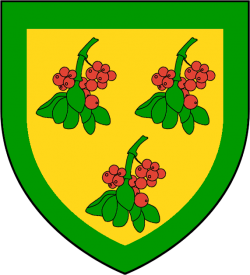 Three sprigs of mistletoe, green and red, on a gold field within a green border (Or, three sprigs of mistletoe vert, fructed gules, within a bordure of the second) |