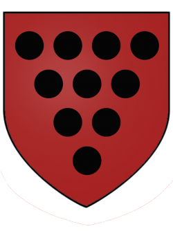 Ten black pellets, on a scarlet field (Gules, ten pellets, 4, 3, 2, 1) |