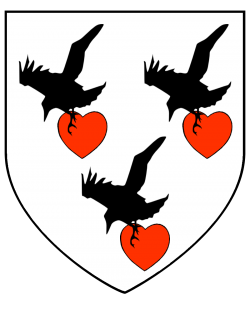 Three black ravens in flight, holding three red hearts, on a white field (Argent, three ravens volant sable, each clutching in their claws a heart gules) |