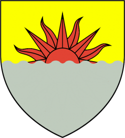 A red sun rising from a grey-green sea, against a yellow sky (Per fesse wavy or and vert-cendrée, a demi-sun-in-splendour issuant from the line of division gules) |