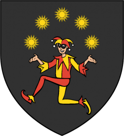A fool in red and gold motley juggling five suns, on a black field (Sable, a fool proper clothed in motley gules and or, juggling five suns-in-splendour of the last) |