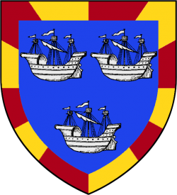 Three silver ships on a blue field with a border of crimson and gold (Azure, three galleys argent within a bordure compony gules and or) |