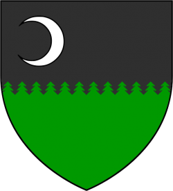 Neither their arms or their words appear in the books, but according to semi-canon sources their arms are blazoned per fess, a white crescent moon in the first on black above a green field, a sprucetree line between.[1]