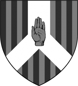 A grey stone hand upon a white inverted pall on paly black and grey (Paly sable and cendrée on a pall inverted argent a hand couped of the second) |