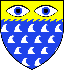 A blue field strewn with whitecaps, on a yellow chief with crested line a pair of blue eyes (Azure semé of whitecaps argent, on a chief wavy crested or two eyes of the second irised of the first and pupiled sable) |